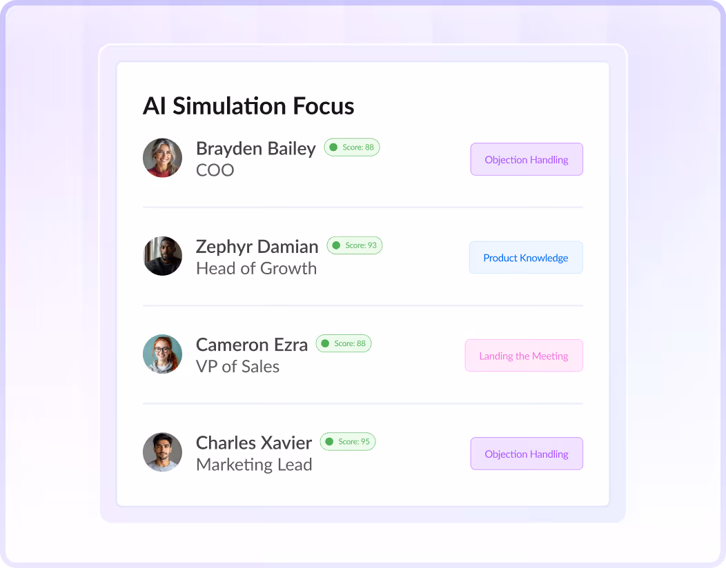 Automatically create custom AI personas that mimic your actual prospects based on real calls. Ensure reps practice on reality – from tone to objections to global languages – not generic templates.