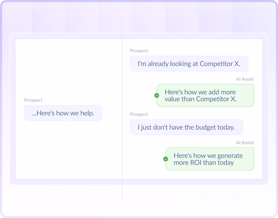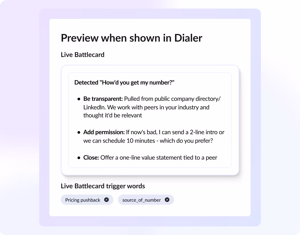 Give every rep a safety net. When a prospect throws a curveball, the right answer appears automatically. Live battlecards and guidance make sure that conversations never go off your rails.