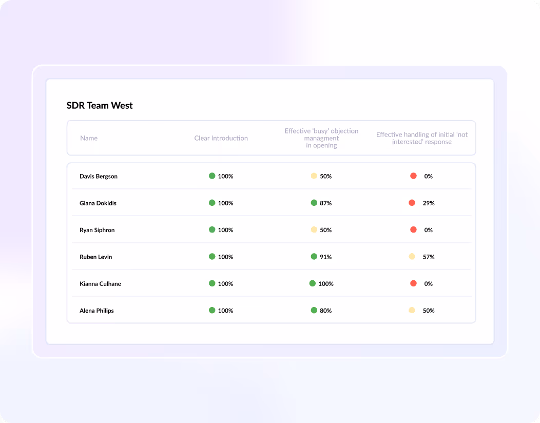 Dashboards show team metrics, rep-level scoring, and peer benchmarks so coaching becomes measurable. You can track whether training is working and where to focus coaching.