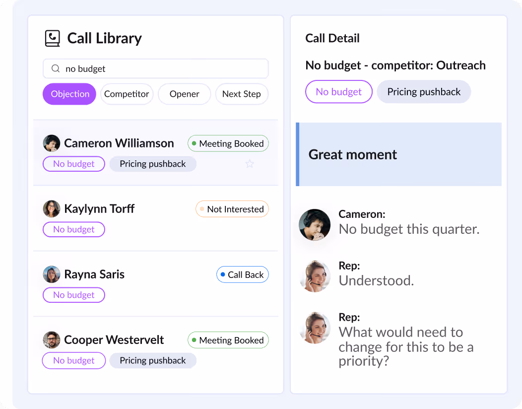 Every call is captured, transcribed, and searchable by keyword, topic, or objection. Share examples from your best reps so others can hear what “great” sounds like and copy it fast.