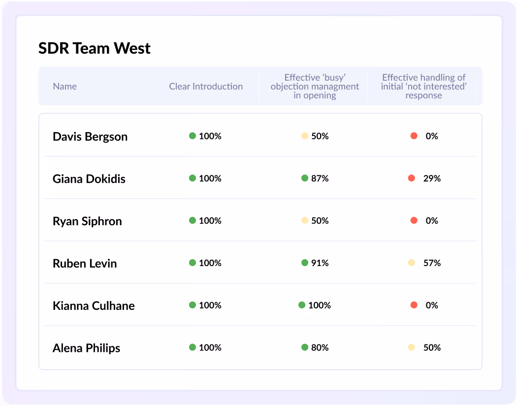 Dashboards show team metrics, rep-level scoring, and peer benchmarks so coaching becomes measurable. You can track whether training is working and where to focus coaching.