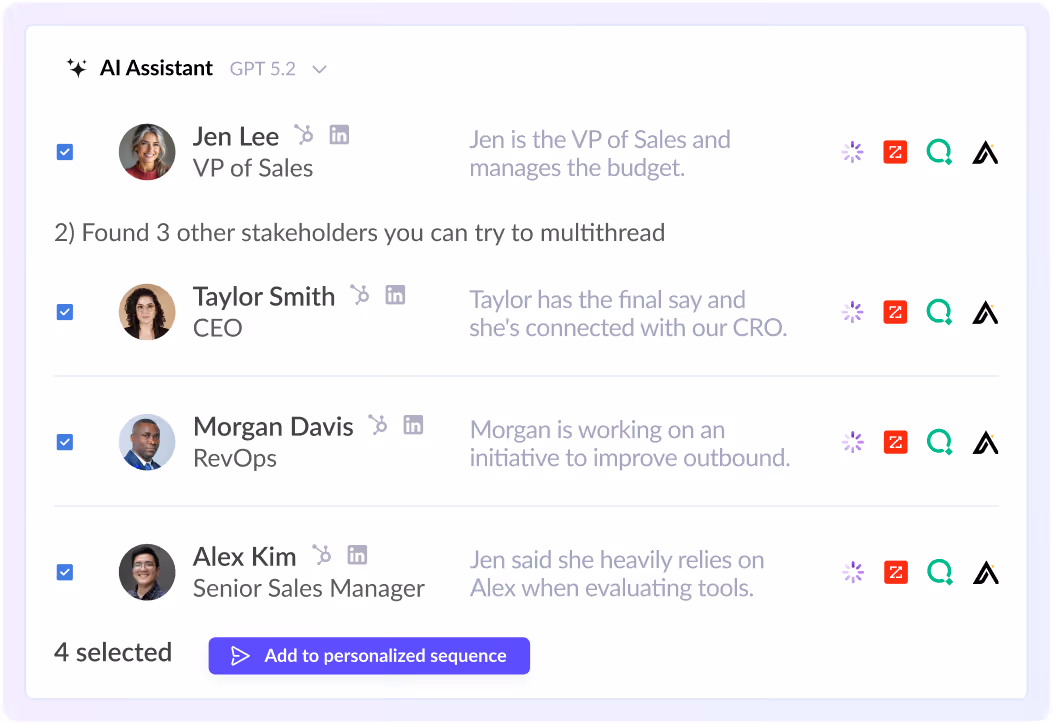 Connect your CRM and data providers into one unified workspace where reps and AI agents work together to drive pipeline