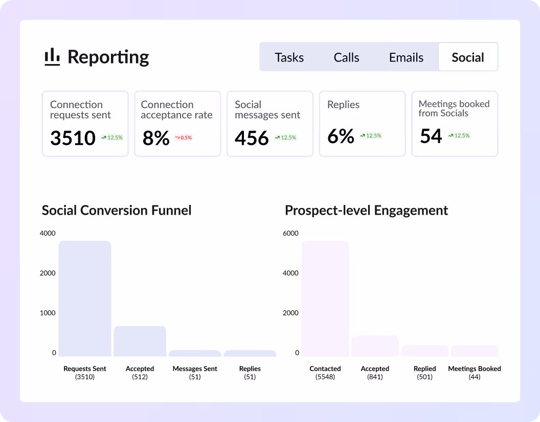 Stay on top of where you are for all of your outbound channels. Whether it’s calling, email, SMS, or social, you’ll stay in the know about what stage your prospects are at and what’s working.