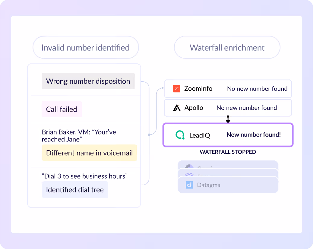 Detect missing or invalid contact information. Waterfall enrich to find the best data directly where you call.