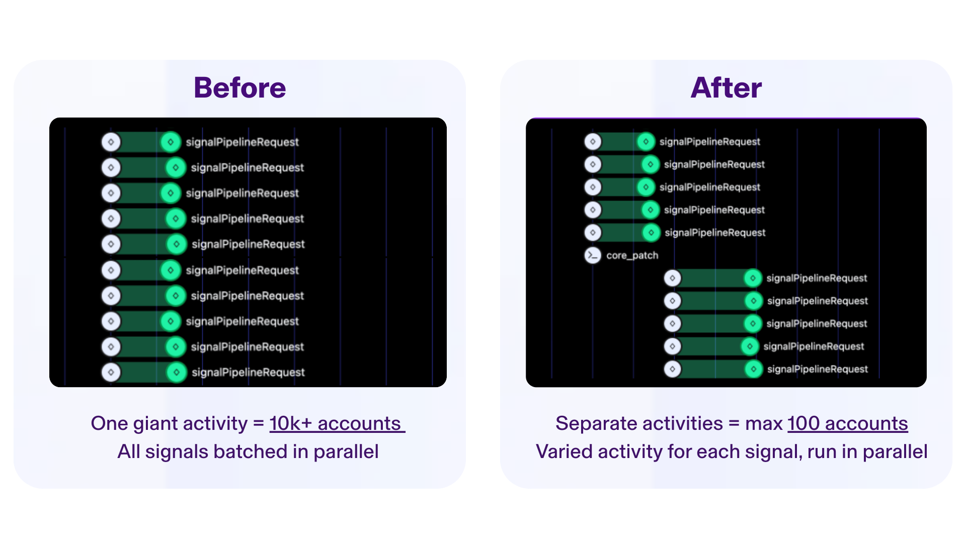 Since our job was already highly parallel, we could easily move our concurrency limits upstream. So, we split off smaller activities, like loading data and updating the frontend, and limited our main processing activities to handle a max of 100 accounts and a single signal. A fixed maximum processing size per activity gave us confidence that continued expanding scale wouldn’t cause these same issues in the future.