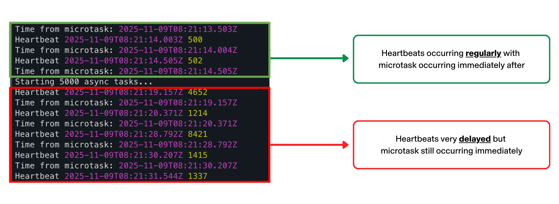 Since JavaScript is single-threaded, the high parallelism was saturating the event loop, a problem compounded by the fact that our heartbeat code was creating a macrotask which would only be scheduled when the long queue of microtasks was complete.