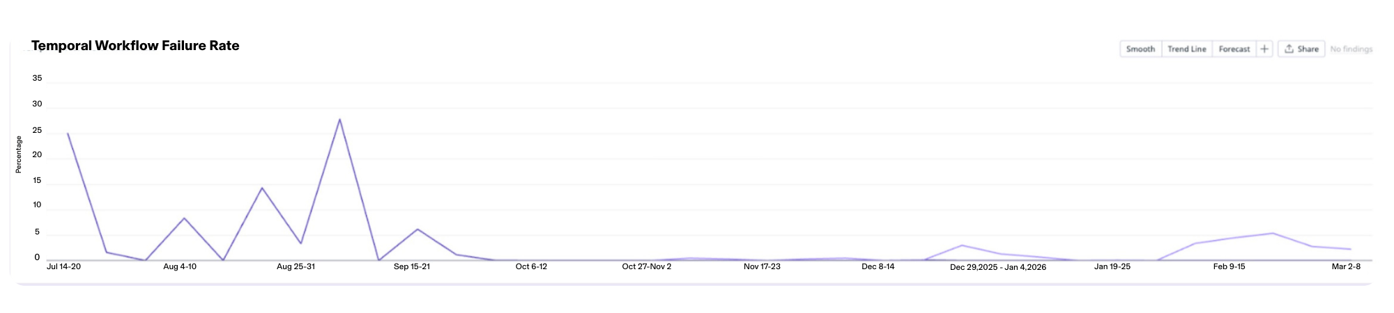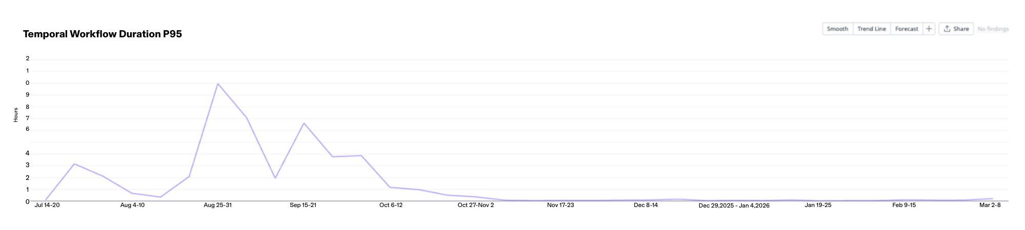 In the end, we made such great improvements that even we were surprised by just how much impact these changes had made. Our error rates were down to <1% and our P95 and average workflow times were cut in half.
