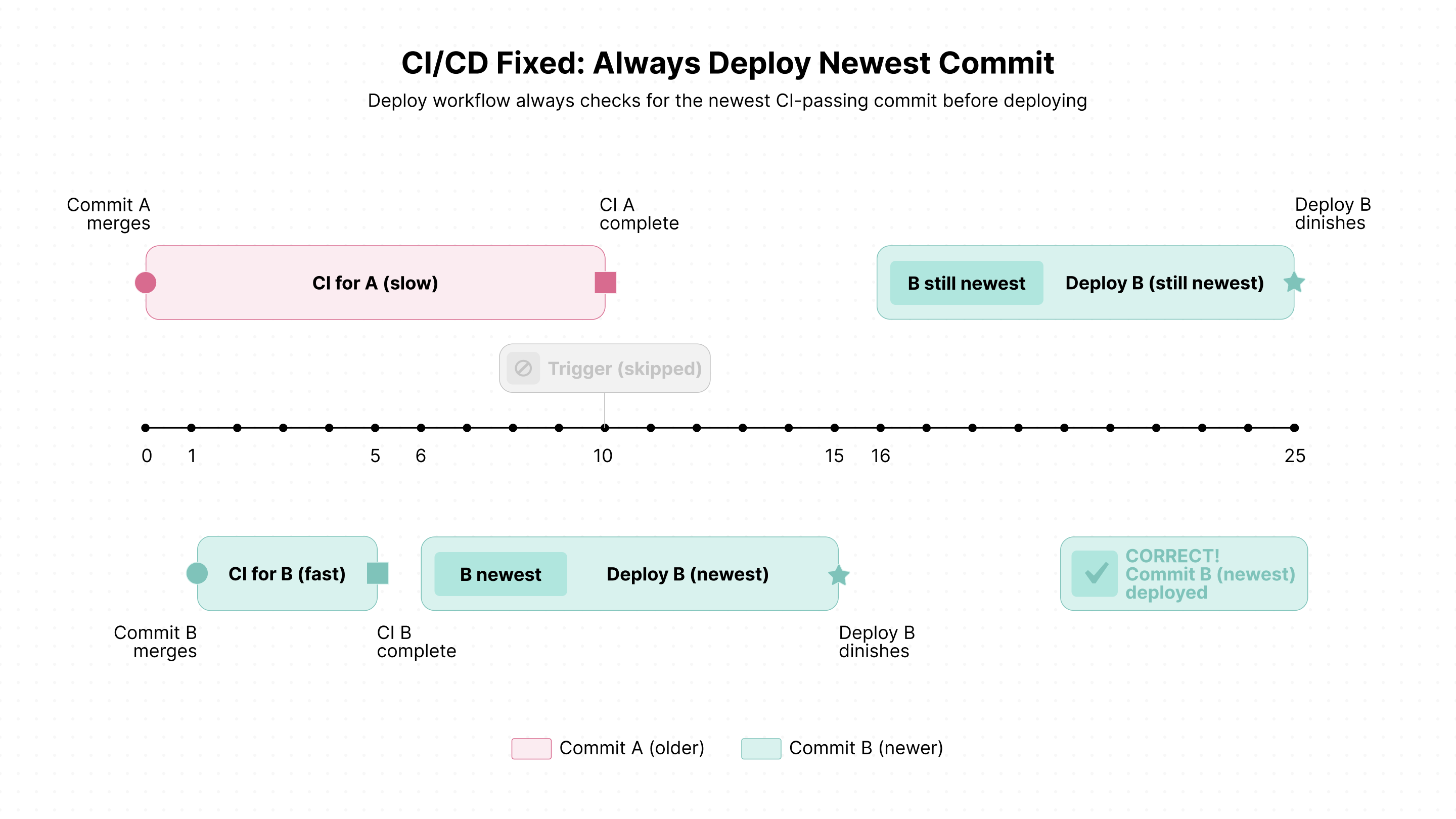 This "last-arrival-wins" behavior is perfect! If multiple commits arrive during a deployment, only the newest needs to be deployed next, since it incorporates all previous changes.