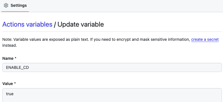 Nooks uses GitHub Actions repository variables to control the CD system. Repository administrators set the ENABLE_CD variable to true or false to enable or disable automated deployments.
