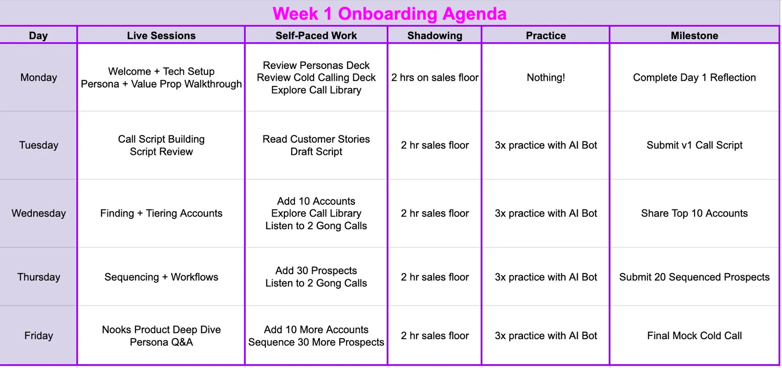 At Nooks, new SDRs are booking meetings in their second week and hitting full quota by their second month.