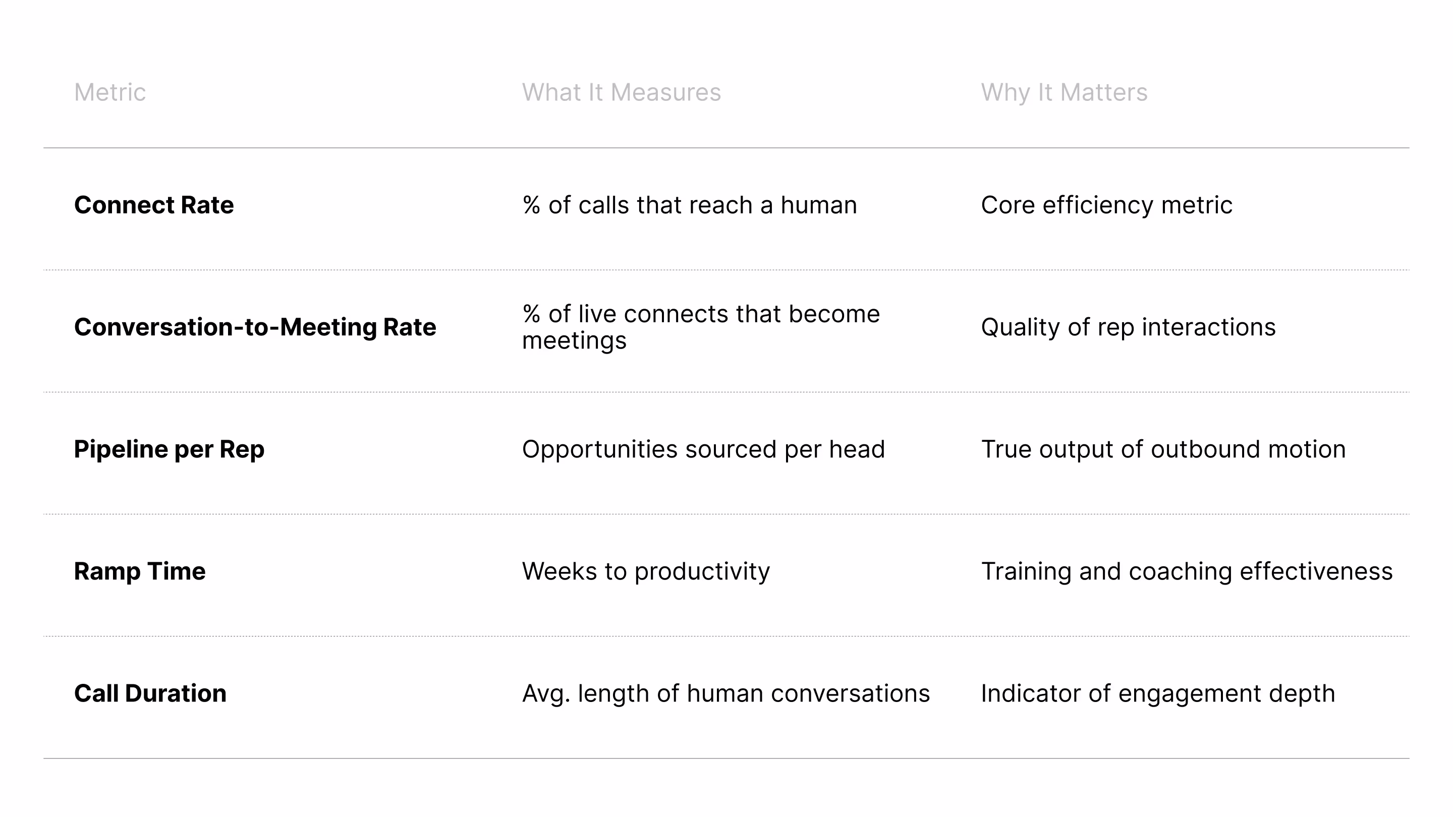 Focus on connect rate, conversation-to-meeting rate, pipeline per rep, and ramp time. Those reveal both productivity and quality.