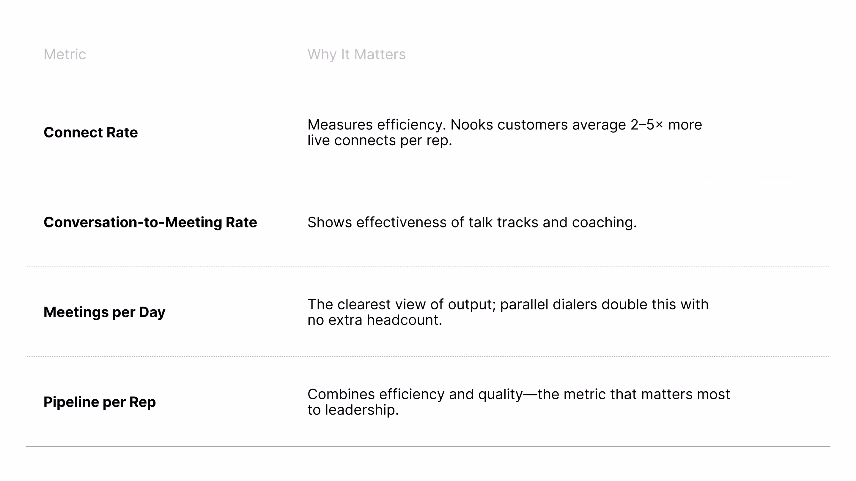 “Before Nooks, our reps could do 60 calls and hope for a couple of connects. Now they average 200+ dials with live conversations every hour,” said one enterprise SDR leader.