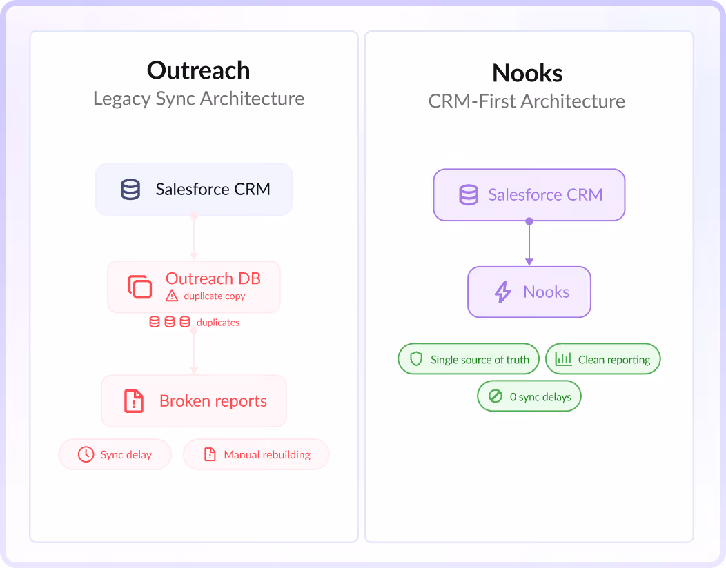 Outreach duplicates your CRM data, creating sync delays and duplicate records that force RevOps teams to rebuild reports in your CRM.
