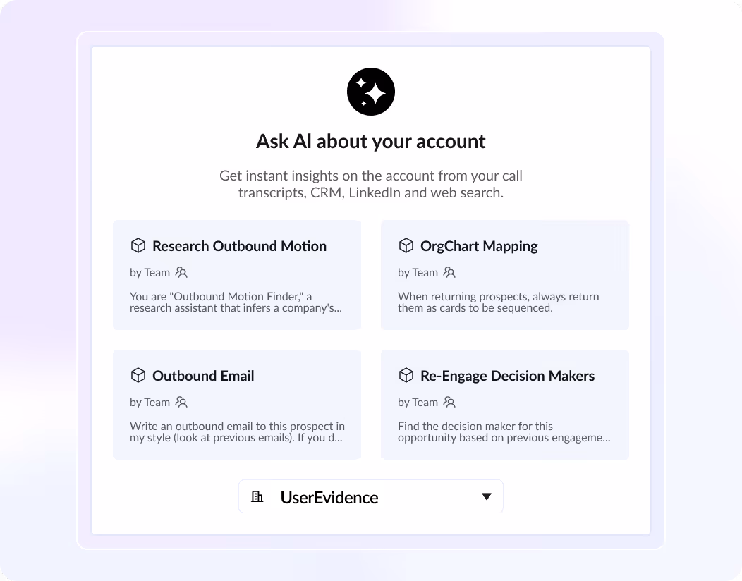 Pull market, call, CRM context, and signals from AI powered account research, so reps know what to say before they call or message.